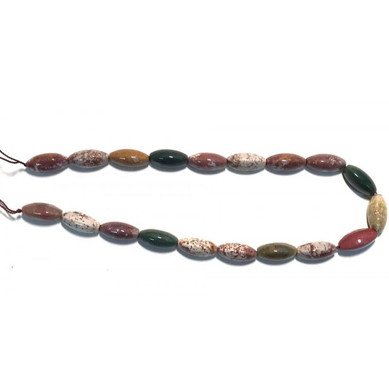 Jaspe Océano en forma de oliva en nuestra tira de 40 cm. La medida de cada una de estas olivas es de 10*20 mm.